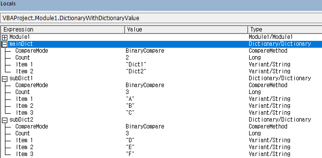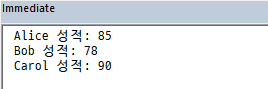 Debug.Print myDict("name") ' 출력값: 홍길동