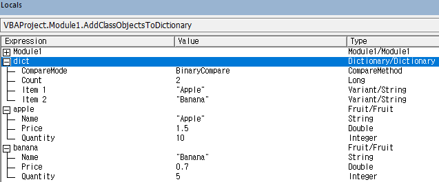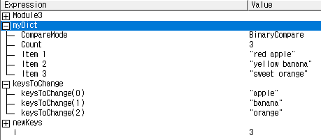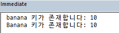 Debug.Print "Banana 키가 존재합니다: " & dict("Banana")