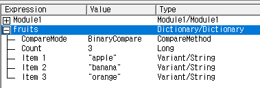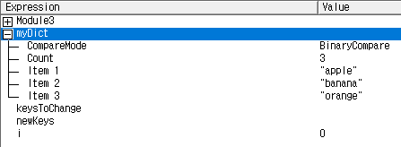fruits.Add "apple", 3 ' 새로운 항목 추가: Key = "apple", Item = 3