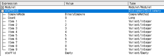 Debug.Print "사원번호: " & staffId & ", 이름: " & staffDict(staffId)