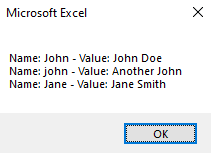 MsgBox "Name: John - Value: " & nameList("John") & vbCrLf & _
