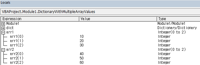 Debug.Print myDict(CStr(i)) ' 출력값: 값1, 값2, 값3, 값4, 값5