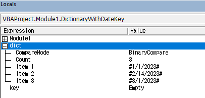 Debug.Print "날짜: " & CStr(key) & ", 설명: " & dict(key)