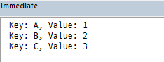 Debug.Print keyToCheck & " 키가 존재합니다. 값: " & dict(keyToCheck)