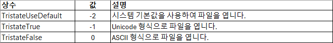 format : 선택적인 요소. 세 개의 Tristate 값 중 하나를 사용하여 열릴 파일의 형식을 나타냅니다. 생략하면 파일은 ASCII 형식으로 열립니다.