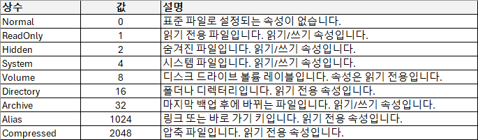 파일이나 폴더의 속성을 설정하거나 반환합니다. 속성에 따라 읽기/쓰기 또는 읽기 전용이 됩니다.