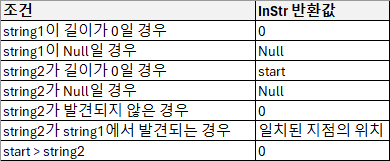 한 문자열 안에 특정 문자열이 처음으로 나타난 위치를 지정하는 Variant(Long) 값을 반환합니다.