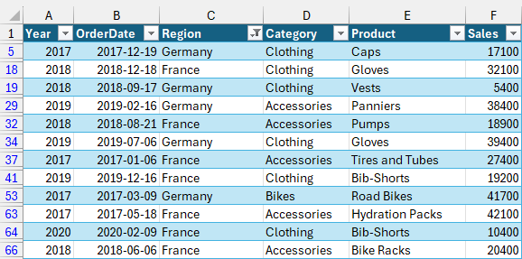 tbl.Range.AutoFilter Field:=3, Criteria1:="Germany", Operator:=xlOr, Criteria2:="France"