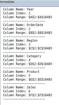 다음 코드는 지정된 시트의 지정된 테이블에 있는 각 열의 이름, 인덱스, 범위를 출력합니다.