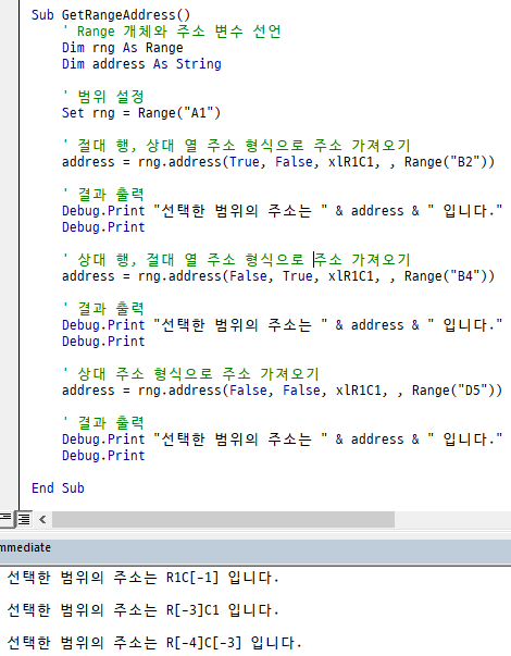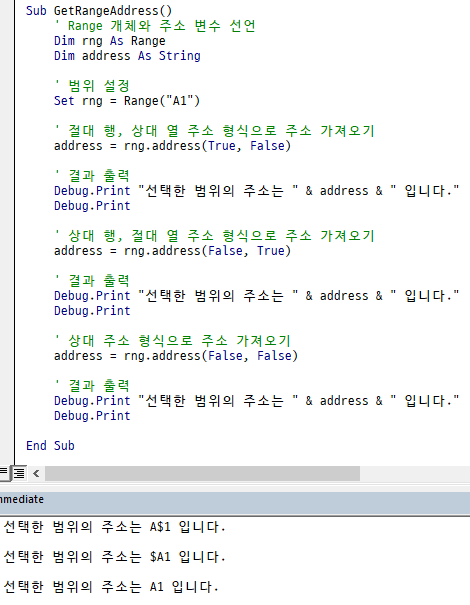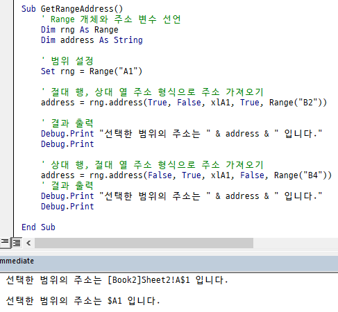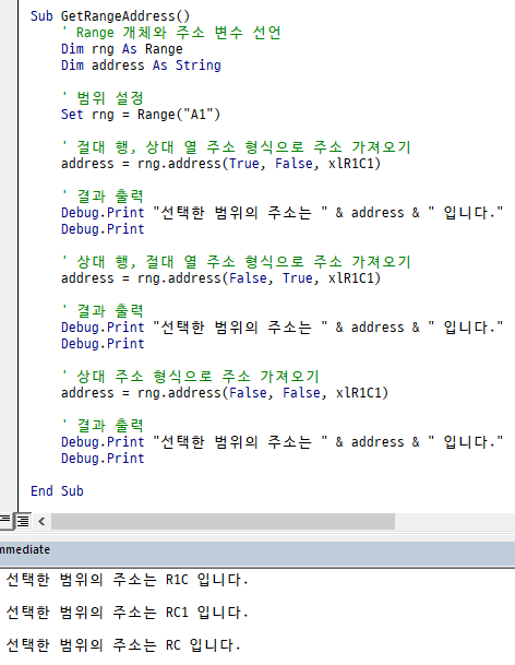 Range개체의 Address속성은 범위 참조를 나타내는 문자열 값을 반환합니다.