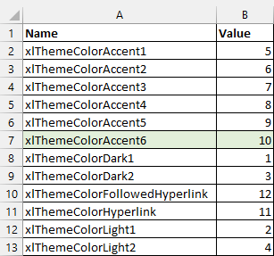 Interior개체의 경우 매크로 기록을 하면 .ThemeColor = xlThemeColorAccent6라고 기록됩니다.