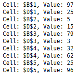 Debug.Print "Cell: " & cell.Address & ", Value: " & cell.Value