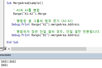 Debug.Print "병합된 영역의 주소: " & mergeArea.Address