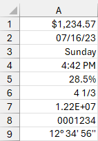 formats = Array("$#,##0.00", "mm/dd/yy", "dddd", "h:mm AM/PM", "0.0%", "# ?/?", "0.00E+00", "0000000", "##0° 00' 00''")