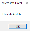 다음 예시에서는 MsgBox 함수의 반환값을 변수 myVar에 저장하여 선택된 버튼을 나타내는 숫자를 받습니다. 반환값을 사용하므로 괄호가 필요합니다. 그 다음, 변수의 값이 표시되도록 다른 메시지 상자가 나타납니다.(이 예제에서는 Yes를 눌렀습니다)