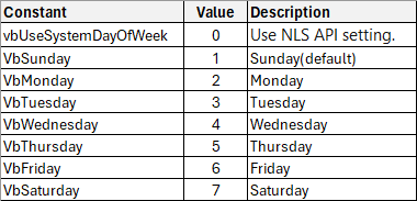 firstdayofweek 인수의 값은 아래와 같습니다.