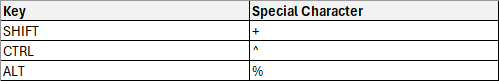 SHIFT, CTRL 또는 ALT와 함께 일반 키 입력으로 구성된 키보드 문자를 보내려면 키 입력 조합을 나타내는 복합 문자열 인수를 만듭니다. 일반 키 입력 앞에 다음 특수 문자 중 하나 이상을 사용하여 이를 수행합니다.