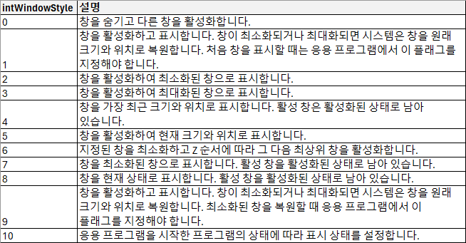 intWindowStyle : 선택적인 요소. 프로그램 창의 모양을 나타내는 정수 값입니다. 일부 프로그램만 이 정보를 사용합니다.