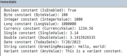 Debug.Print "String constant (GreetingMessage): " & GreetingMessage