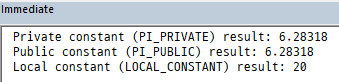Debug.Print "Private constant (PI_PRIVATE) result: " & result1 & vbCrLf _