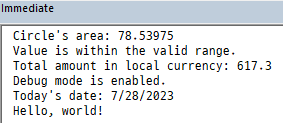 Debug.Print "Circle's area: " & area