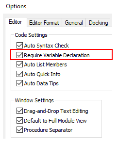 Visual Basic 프로그래밍 환경에서 옵션을 설정하여 모든 새 모듈에 Option Explicit 문을 자동으로 포함할 수 있습니다. 이 옵션은 작성한 기존 코드를 변경하지 않는다는 점에 유의하세요.