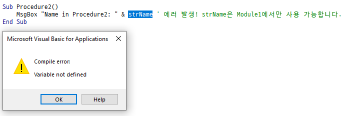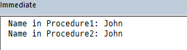 Debug.Print "Name in Procedure2: " & strName ' 변수 strName의 값을 메시지 박스로 출력합니다.