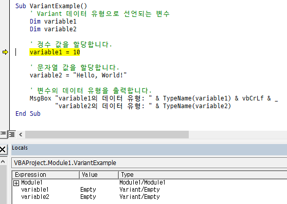 데이터 유형을 지정하지 않으면 기본적으로 Variant 데이터 유형이 할당됩니다.