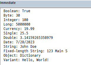 변수는 다음 데이터 유형 중 하나로 선언할 수 있습니다Boolean, Byte, Integer, Long, Currency, Single, Double, Date, String (for variable-length strings), String * length (for fixed-length strings), Object, or Variant.