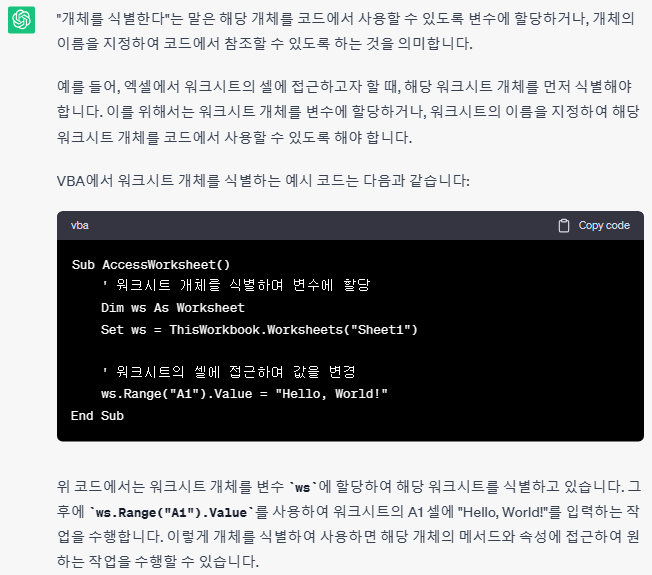 개체는 워크시트, 셀, 차트, 양식 또는 보고서와 같은 응용 프로그램의 요소를 나타냅니다. Visual Basic 코드에서 개체의 메서드 중 하나를 적용하거나 해당 속성 중 하나의 값을 변경하려면 먼저 개체를 식별해야 합니다 .