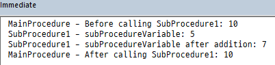 Debug.Print "SubProcedure1 - subProcedureVariable after addition: " & subProcedureVariable