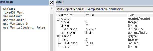 Debug.Print "userVar.age: " & userVar.age ' 결과: 0 (정수 변수는 0으로 초기화)