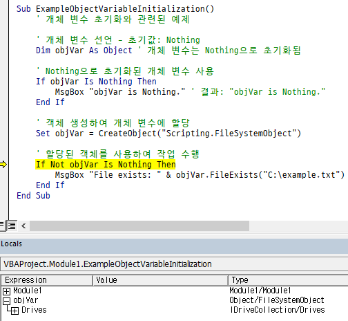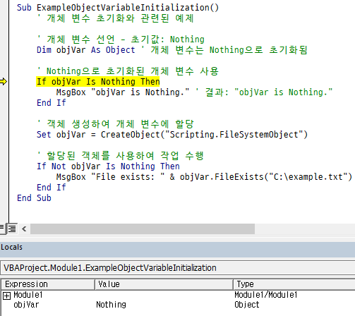 개체 변수를 선언하면 메모리에 공간이 예약되지만 Set 문을 사용하여 객체 참조를 할당할 때까지 해당 값은 Nothing으로 설정됩니다.