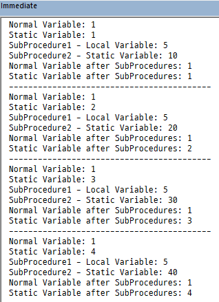 Debug.Print "SubProcedure2 - Static Variable: " & staticVar
