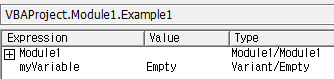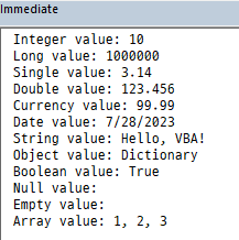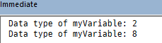 Debug.Print "Data type of myVariable: " & VarType(myVariable)