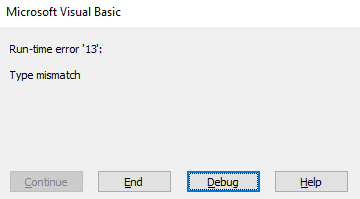 변수 또는 인수의 데이터 유형을 지정한 다음 잘못된 데이터 유형을 사용하면 데이터 유형 오류가 발생합니다. 데이터 유형 오류를 방지하려면 암시적 변수(Variant 데이터 유형)만 사용하거나 모든 변수를 명시적으로 선언하고 데이터 유형을 지정하세요. 후자의 방법을 선호합니다.
