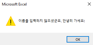 MsgBox "이름을 입력하지 않으셨군요. 안녕히 가세요!", vbExclamation
