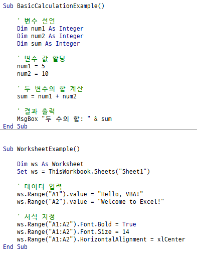 MsgBox "안녕하세요! VBA를 공부하고 있습니다." ' 메시지 박스로 사용자에게 인사 (Greeting the user with a message box)